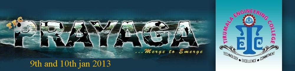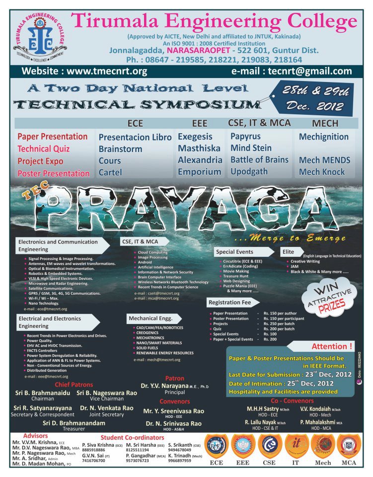 Prayaga is a national level technical symposium which is being organized by Tirumala Engineering college. PRAYAGA- doesn't it sound strange! May be so, but the concept of it is familiar enough for us. It is a symbol of holy confluence. Similarly,technology, too, is a confluence - an amalgam of so many branches of engineering. Considering its holistic nature it is decided to celebrate the Fest involving all the departments. Students, what ever their branches are fired by the same vision and driven by the same motivations to unravel the intricacies and nuances of technology which has so drastically revolutionized life.